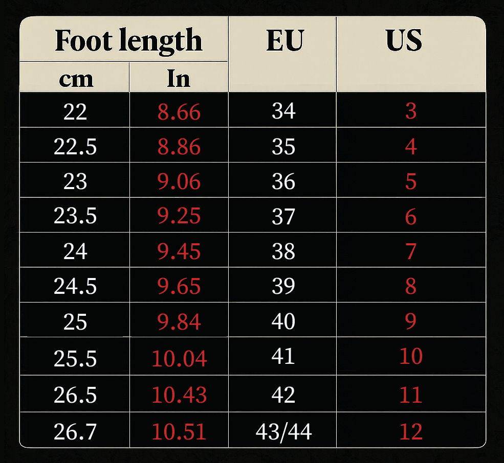 - EU sizes, measure your foot in centimetres (cm).