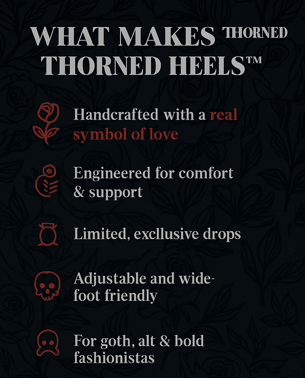 Thorned Heels™ put comfort first without sacrificing style. Cushioned insoles, wide-fit friendly sizing.